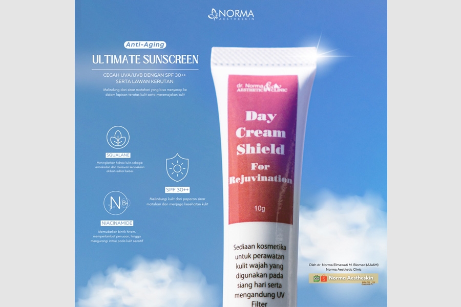 Cream untuk melindungi dari sinar matahari langsung yang mengandung campuran UV Filter (SPF 30), Niacinamide, Lactic Acid, untuk mencerahkan dan melembabkan kulit, mengangkat sel-sel kulit mati, serta mengandung campuran antioksidan Camellia Sinensis leaf Ektract (EGCG), Ceramide, Ubiquinone, Vitamin E, Squalene , sebagai anti-aging, membantu merangsang kolagenitas kulit, memperbaiki barrier kulit, serta mengandung hyaluronic acid membantu mengunci hidrasi kulit wajah. dapat digunakan siang hari.